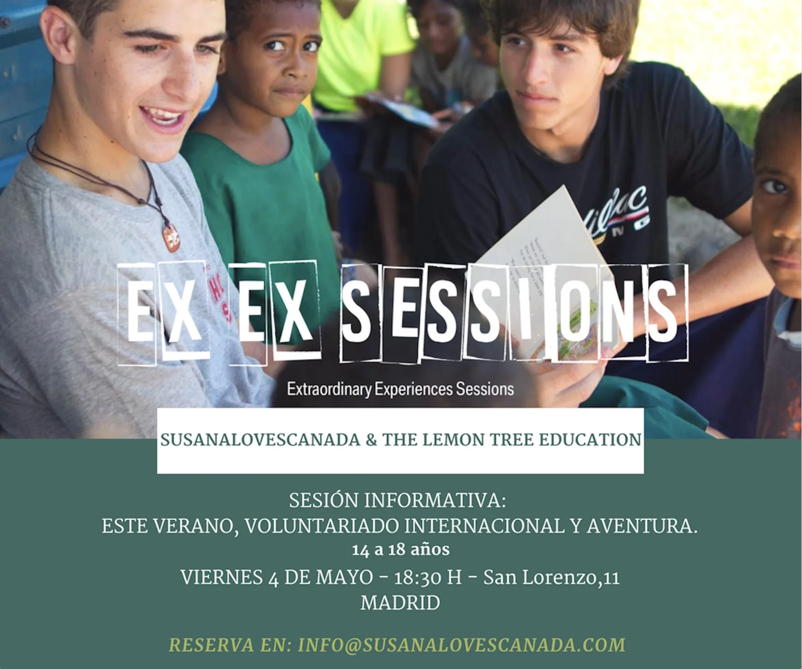 La sesión EXEX "Este Verano, Voluntariado Internacional y Aventura. Aprendizaje a través de la experiencia práctica" estará dirigida por Susana Bernardini, fundadora de Susana Loves Canadá & obp, Plataforma de Asesoría en Educación Internacional, y la charla será presentada por Oliver Rodríguez, co-fundador de The Lemon Tree Education y experto en Programas Internacionales de Desarrollo Personal.